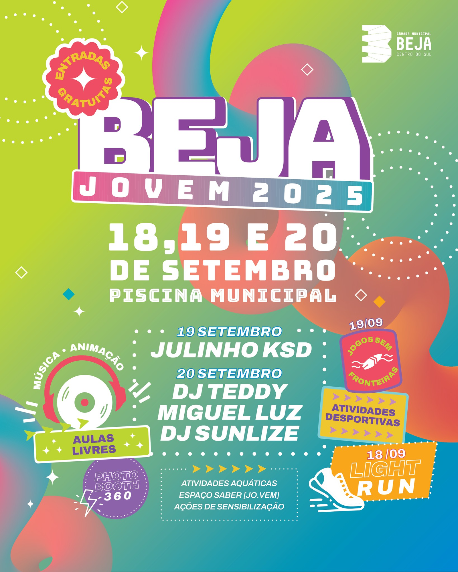 Beja irá celebrar o Dia Internacional da Juventude com o evento “Beja Jovem 2025”. O evento, que tem entrada gratuita e é aberto à comunidade, ocorrerá de 18 a 20 de setembro de 2025, na Piscina Municipal de Beja.