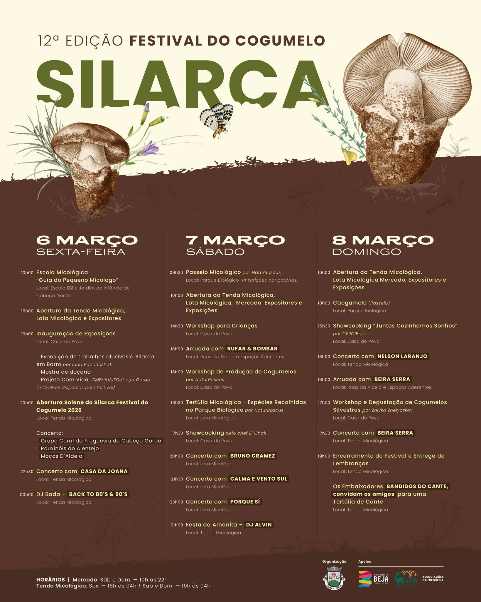 A Junta de Freguesia de Cabeça Gorda promove, nos dias 6, 7 e 8 de março, a XII edição do Silarca – Festival do Cogumelo, iniciativa que se tem afirmado como uma referência regional na valorização dos recursos naturais, da gastronomia e da identidade cultural alentejana. O evento decorre em Cabeça Gorda, no concelho de Beja, e tem como protagonista a silarca (Amanita ponderosa), espécie silvestre de elevado valor gastronómico que nasce espontaneamente nos montados da freguesia.