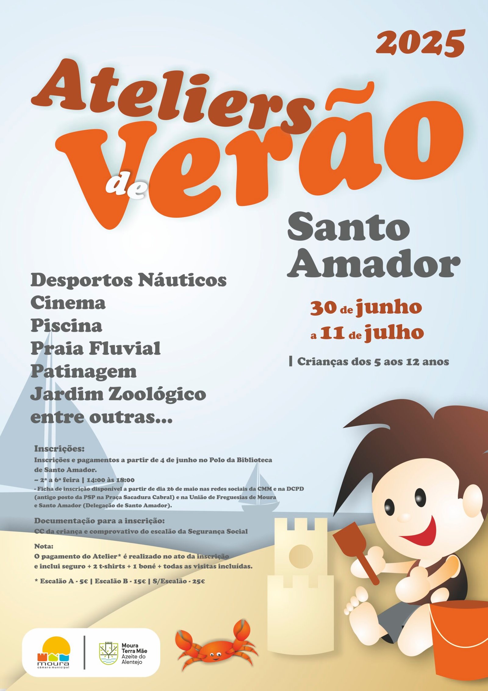 Os ateliers são destinados a crianças dos 5 aos 8 anos e a jovens dos 9 aos 12 anos. A programação inclui patinagem, desportos náuticos, momentos de lazer na Piscina Municipal e na Praia Fluvial, e uma visita ao Jardim Zoológico de Lisboa.
