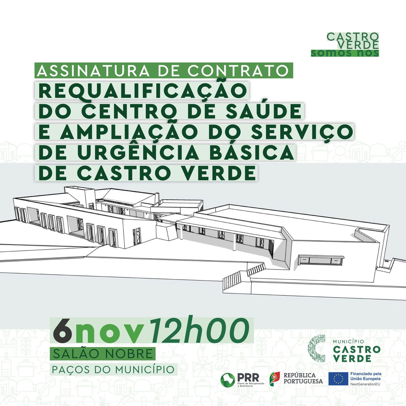A Câmara Municipal de Castro Verde promove esta quinta-feira, dia 6 de novembro, a assinatura do contrato para a requalificação do Centro de Saúde de Castro Verde e ampliação do Serviço de Urgência Básica (SUB).