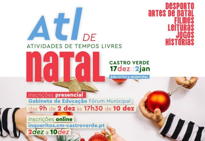 A Câmara Municipal de Castro Verde informa que está a decorrer, até ao próximo dia 10 de dezembro, o período de inscrições para o seu ATL de Natal 2025, um programa de atividades destinado a preencher as férias natalícias das crianças com idades compreendidas entre os 6 e os 12 anos.