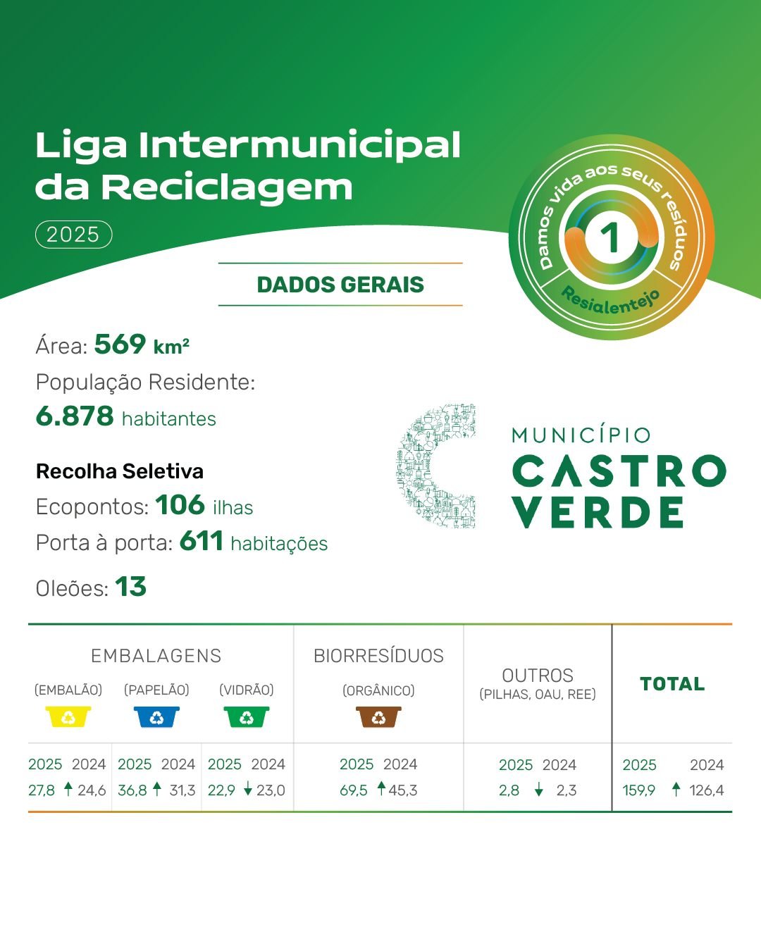 O concelho de Castro Verde voltou a afirmar-se como referência regional na área da reciclagem ao conquistar, pelo segundo ano consecutivo, o 1.º lugar da Liga Intermunicipal da Reciclagem da Resialentejo, relativa ao ano de 2025.