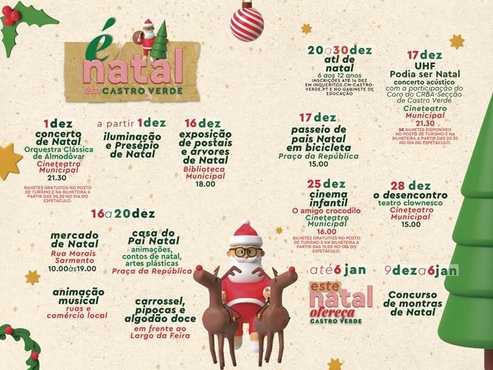 A iniciativa contempla também “animação musical pelas ruas e comércio local de Castro Verde e um programa de animação infantil, onde se inclui a Casa do Pai Natal, Tarde de Cinema Infantil, Carrossel, Pipocas e Algodão Doce e a peça de teatro “Desencontro” (teatro clownesco)”.