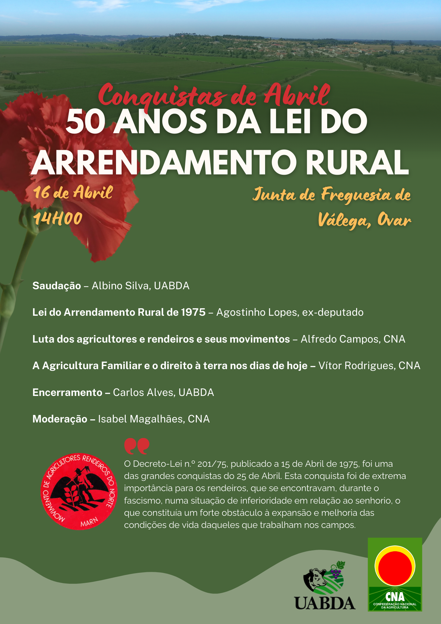 A CNA e a UABDA – União de Agricultores e Baldios do Distrito de Aveiro, promovem hoje uma iniciativa em comemoração dos 50 anos da Lei do Arrendamento Rural, sessão que terá lugar na Junta de Freguesia de Válega, em Ovar, às 14H00.