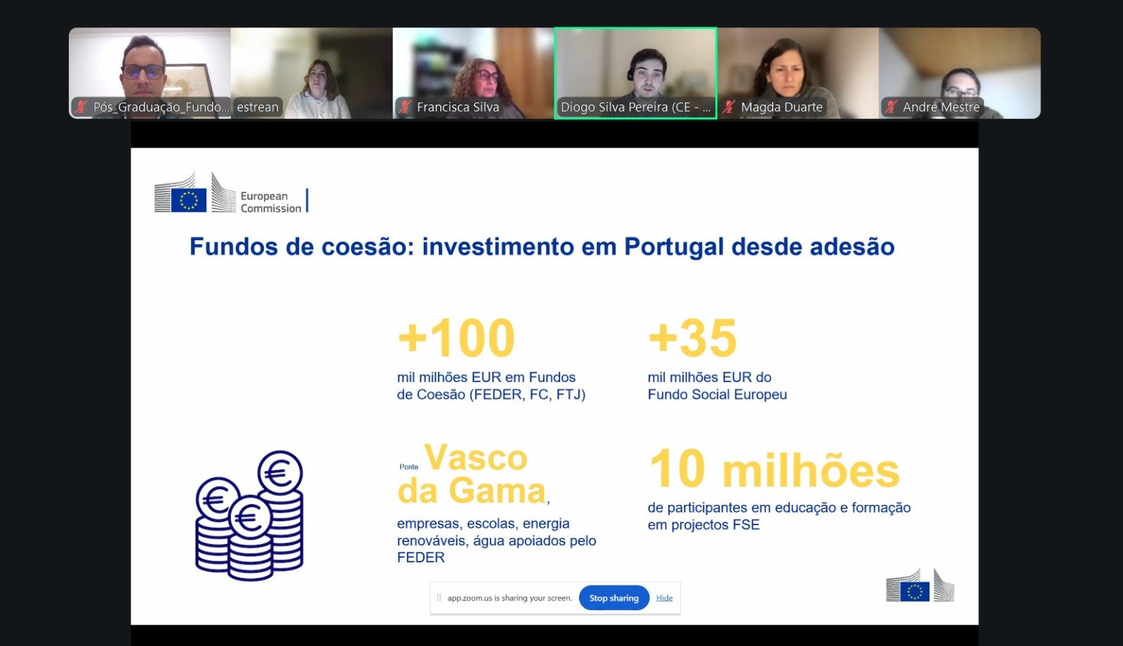 Durante a sessão, que contou com a presença do coordenador técnico da pós-graduação, Tiago Teotónio Pereira, os representantes das instituições europeias detalharam o papel da Comissão Europeia na definição, acompanhamento e avaliação das políticas financiadas pelos Fundos da Política de Coesão. Foram debatidos temas estruturantes como a evolução histórica da política de coesão e as especificidades dos principais instrumentos financeiros, designadamente o FEDER, o Fundo Social Europeu+, o Fundo de Coesão e o Fundo para uma Transição Justa.