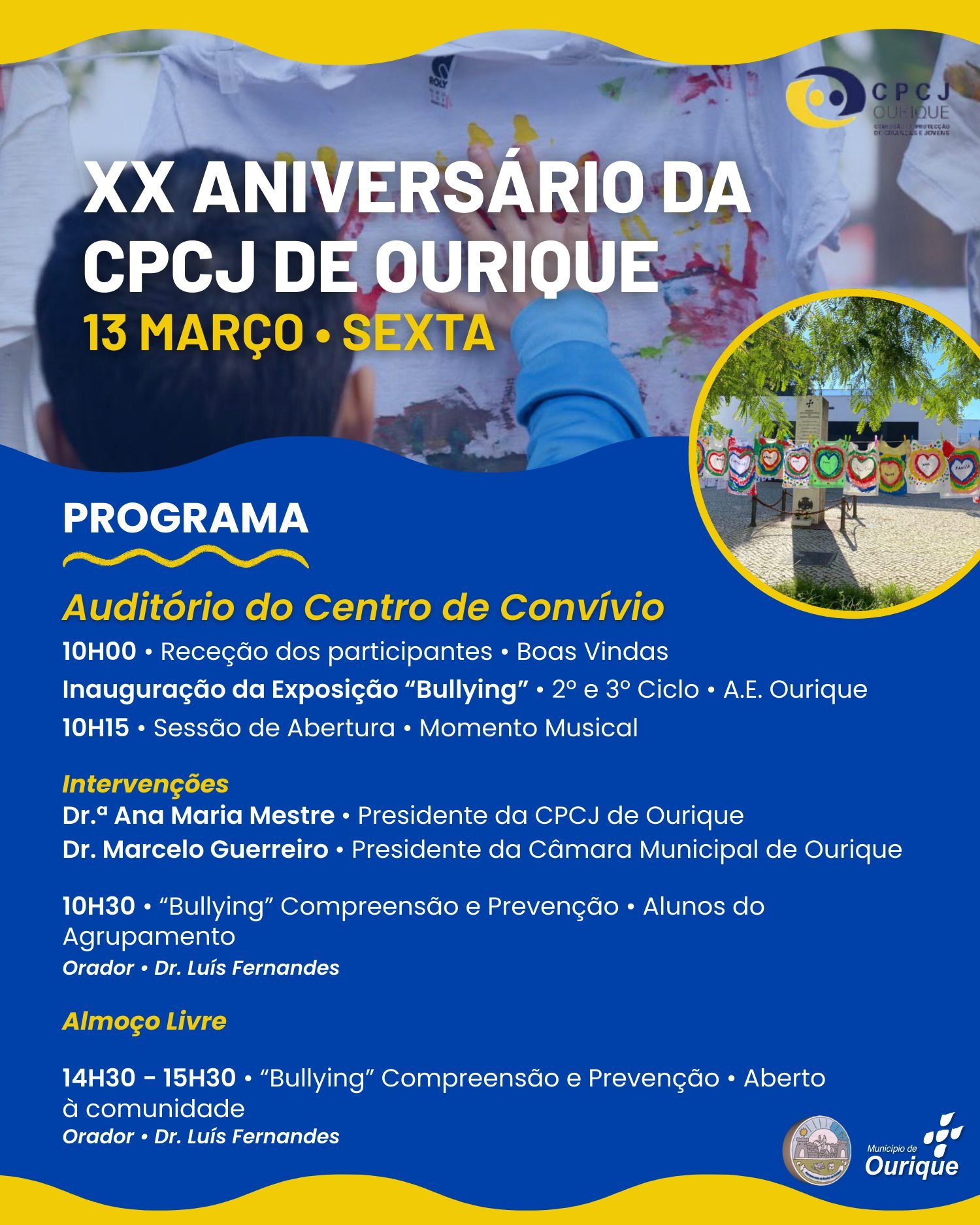 Pelas 10h15 está marcada a sessão de abertura, com intervenções do presidente da Câmara Municipal de Ourique, Marcelo Guerreiro, e da presidente da CPCJ de Ourique, Ana Maria Mestre, seguindo-se um momento musical.