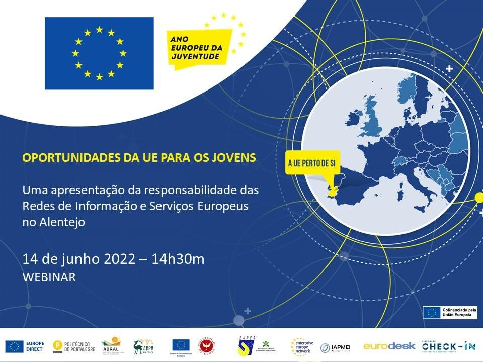 A Rede de Informação e Serviços Europeus do Alentejo promove na terça-feira, 14 de junho, às 14:30, o Webinar Oportunidades da UE para os Jovens, uma iniciativa realizada no âmbito do Ano Europeu da Juventude.