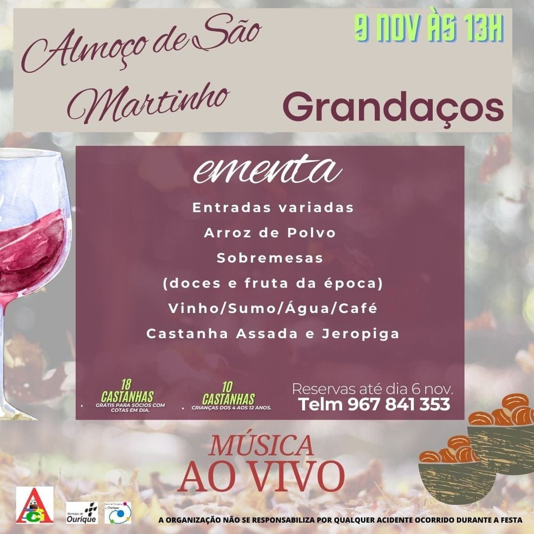 Eventos Hoje há almoço de São Martinho nos Grandaços – Ourique Por Rádio Castrense - 9 de Novembro, 2024 0 27 FacebookTwitterWhatsAppEmailImprimir Este sábado às 13 horas, há almoço de São Martinho nos Grandaços, concelho de Ourique. A organização é da Associação Juvenil e Cultural dos Grandaços e o apoio do Município de Ourique e Junta de Freguesia de Ourique.
