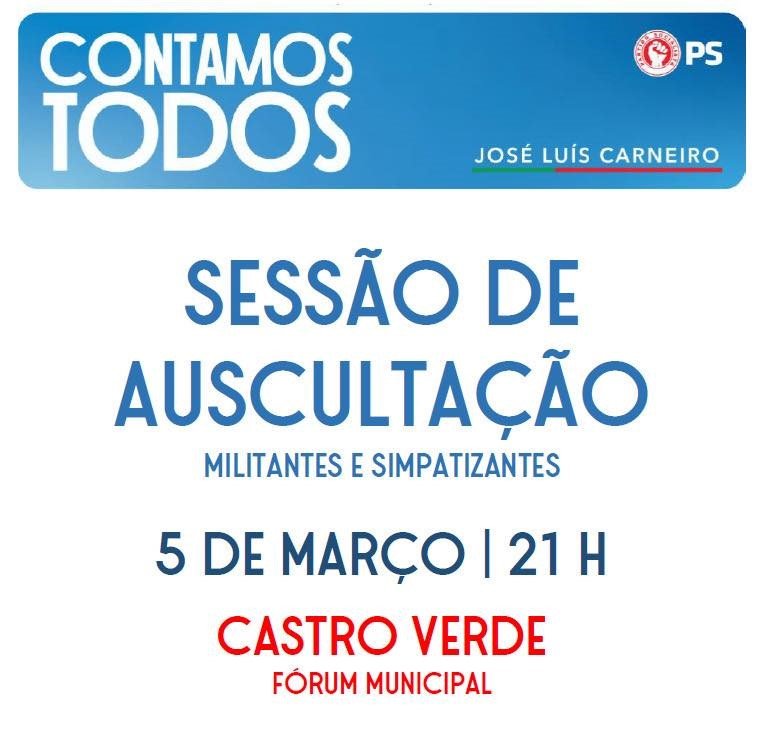 As concelhias do Partido Socialista de Castro Verde, Ourique e Almodôvar promovem esta quinta-feira, às 21 horas, uma sessão de auscultação dirigida a militantes e simpatizantes socialistas. A iniciativa realiza-se no Fórum Municipal de Castro Verde.