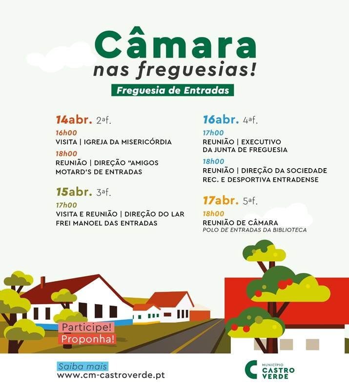 Na quinta-feira, 17 de abril, último dia deste conjunto de encontros com a população na freguesia de Entradas, a reunião da Câmara Municipal será pública e descentralizada, no Polo de Entradas da Biblioteca, pelas 18h00.