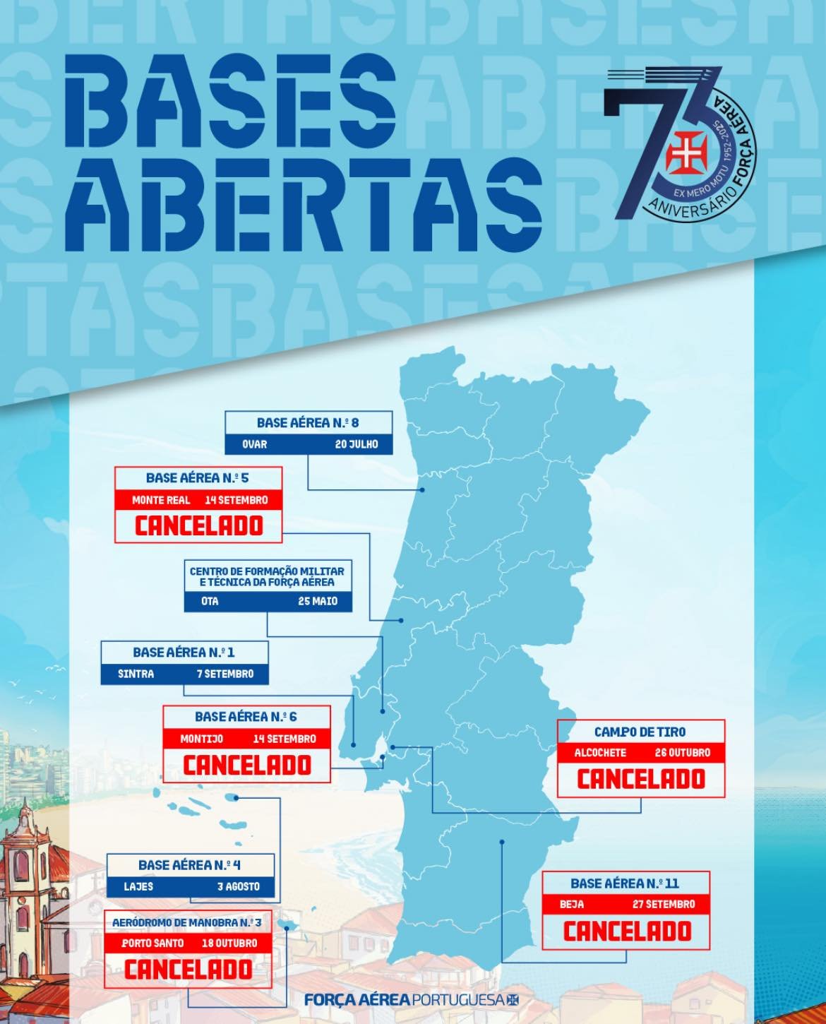 Em relação ao cancelamento dos Dias da Bases Abertas, a Força Aérea Portuguesa adiantou à Rádio Castrense que “foram cancelados por imperiosos motivos operacionais”. A mesma fonte explica que “as edições previstas para as bases aéreas de Monte Real, Montijo e Beja, no aeródromo de Manobra n.º 3, na ilha de Porto Santo, na Madeira, e no Campo de Tiro de Samora Correia, em Alcochete, foram canceladas”.