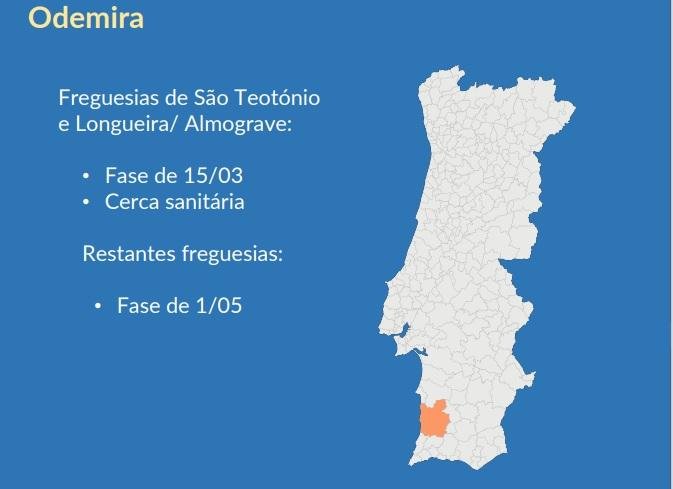 Entretanto, a autarquia de Odemira veio a público dizer que, “face à informação transmitida pelo Sr. Primeiro-ministro ao início da noite, o Presidente da Câmara Municipal de Odemira, José Alberto Guerreiro, convocou de imediato uma reunião extraordinária do executivo municipal, a realizar de forma urgente, (ontem às 22.30 horas), para analisar as medidas anunciadas para o concelho e as suas consequências para o território. O Governo, face à especificidade do concelho de Odemira, decidiu avançar com a implementação de cerca sanitária imediata nas freguesias de S. Teotónio e de Longueira/Almograve. Estas duas freguesias mantêm-se com as medidas restritivas da fase de 15 de março, enquanto que as restantes onze freguesias podem avançar para a quinta fase de desconfinamento a partir do dia 1 de maio”