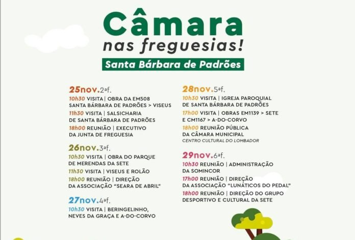 A iniciativa começa esta 2ª feira, com visitas à obra municipal em curso na Estrada Municipal 508, entre Sta. Bárbara de Padrões e Viseus (10h30), e à Salsicharia de Santa Bárbara de Padrões (11h30). Ainda neste dia realiza-se uma reunião com o executivo da Junta de Freguesia de Santa Bárbara de Padrões, a partir das 18h00.