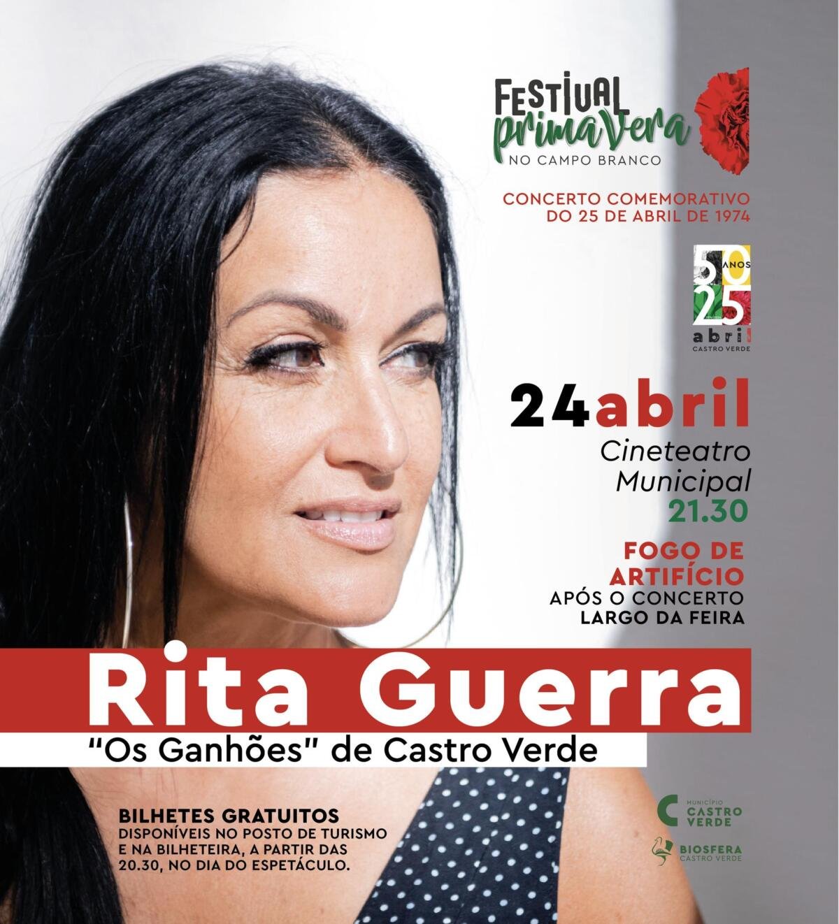 Castro Verde acolhe um espetáculo com Rita Guerra e “Os Ganhões” de Castro Verde. A iniciativa insere-se no festival Primavera no Campo Branco e acontece hoje, noite de 24 de Abril, às 21h30, no Cineteatro Municipal de Castro Verde.