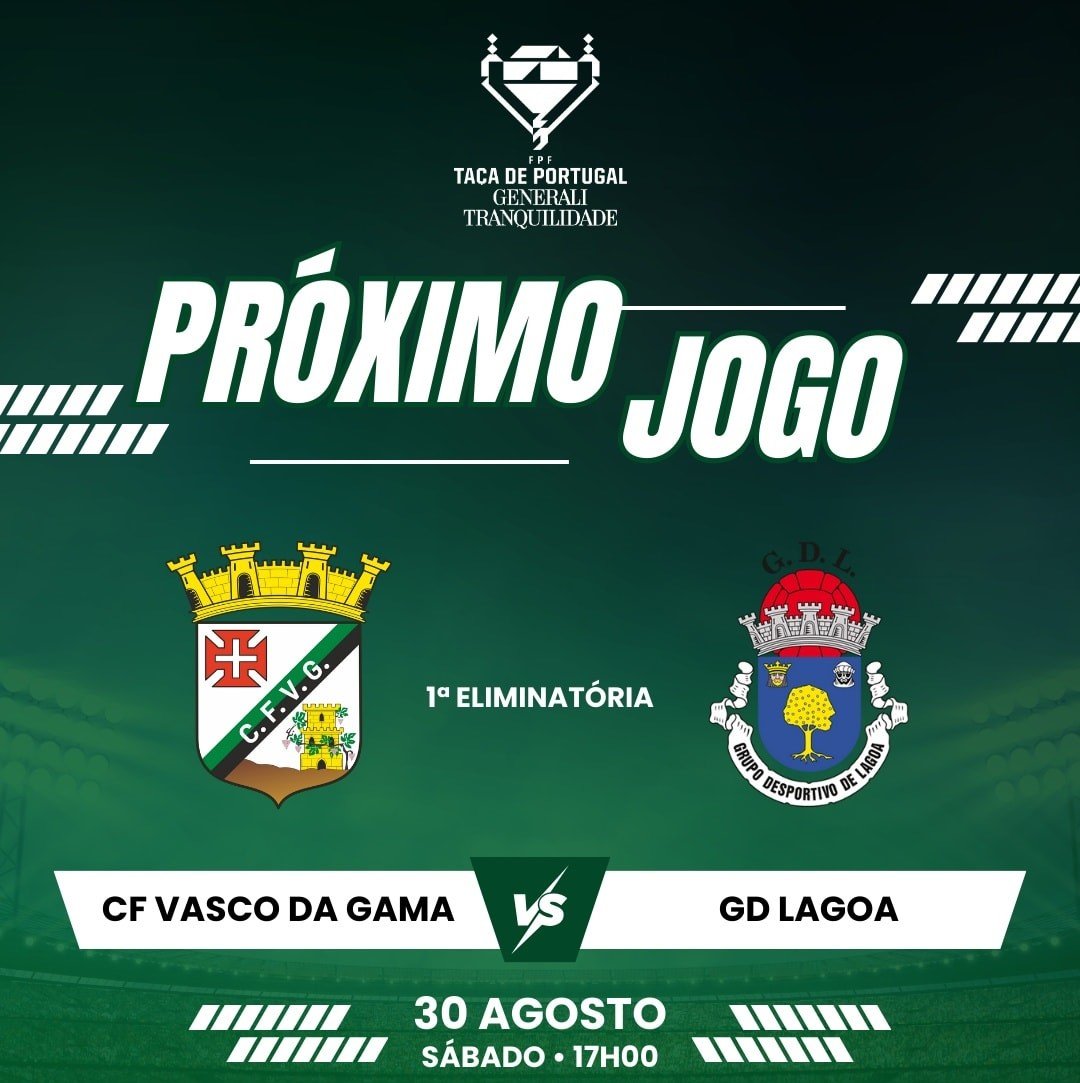 Este sábado, dia 30 de agosto, às 17h00, o CF Vasco da Gama recebe o GD Lagoa no Estádio Municipal da Vidigueira, em jogo a contar para a primeira eliminatória da Taça de Portugal.