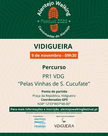 O concelho de Vidigueira vai receber, no dia 9 de novembro, pelas 9h30, o evento “Pelas Vinhas de S. Cucufate”, integrado no Alentejo Walking Festival, organizado pela Turismo do Alentejo, em parceria com o Município de Vidigueira.